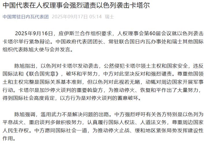 陈旭指出,以色列对卡塔尔发动袭击,公然侵犯卡塔尔领土主权和国家安全,违反国际法和《联合国宪章》,破坏和平努力,中方对此坚决反对和强烈谴责。尊重他国领土和主权完整是国际关系基本准则,但以色列对此视若无睹,动辄对周边国家开展军事行动。卡塔尔是加沙停火谈判的重要斡旋方,为推动停火、恢复和平作出了大量努力,得到国际社会高度肯定,以方行为是对停火谈判的蓄意破坏。